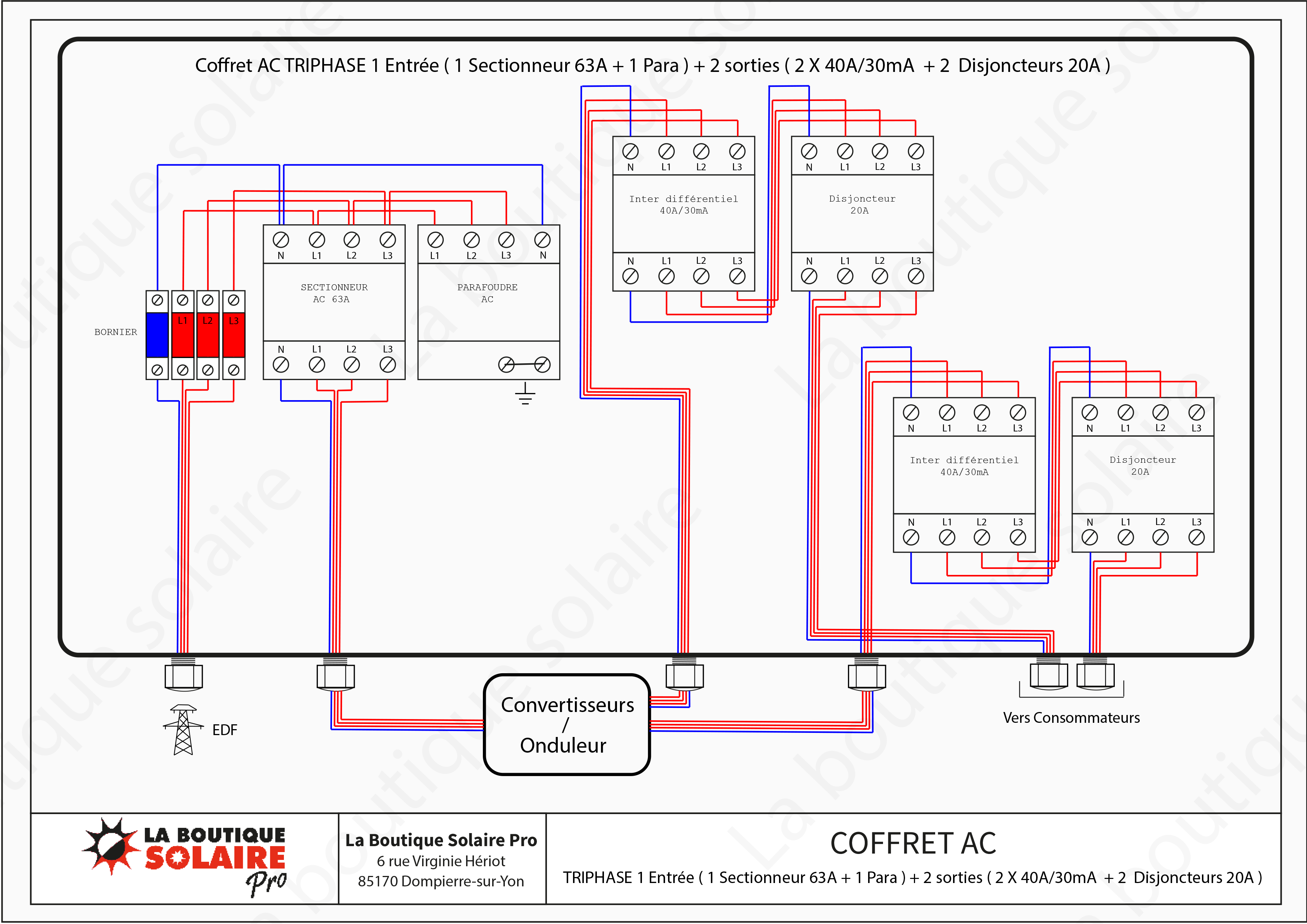 Coffret AC TRIPHASE 1 entrée (1 sectionneur 63A + 1 para) + 2 sorties (2 x 40A/30mA + 2 x Disjoncteurs 20A)