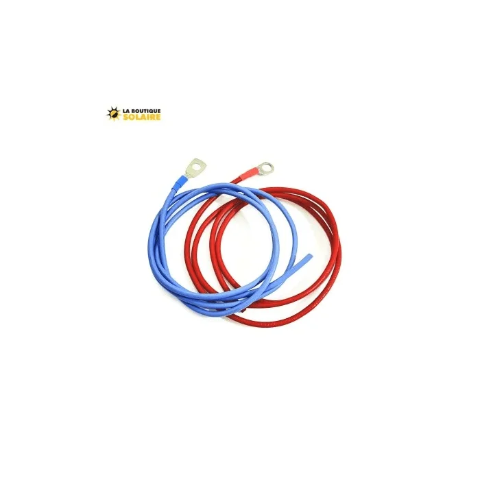 Ce kit est composé de deux câbles pour batterie de section 4 mm2 de couleur bleue et rouge. Chaque câble est d'une longueur d'un mètre et est déjà serti sur l'une des deux extrémités :