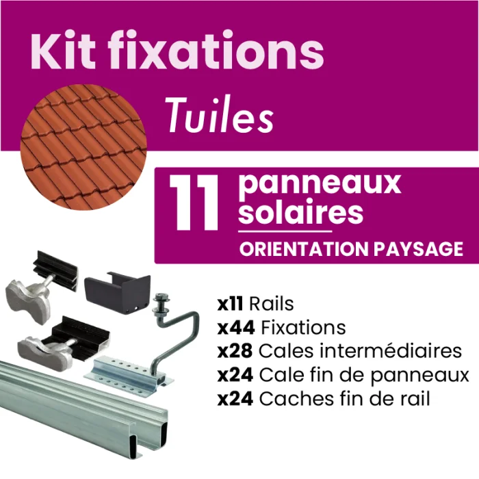 Ce kit a spécialement été conçu pour fixer jusqu'à 11 panneaux solaires sur des tuiles mécaniques. Il permettra une attache sûre et solide de vos panneaux sur votre toit.