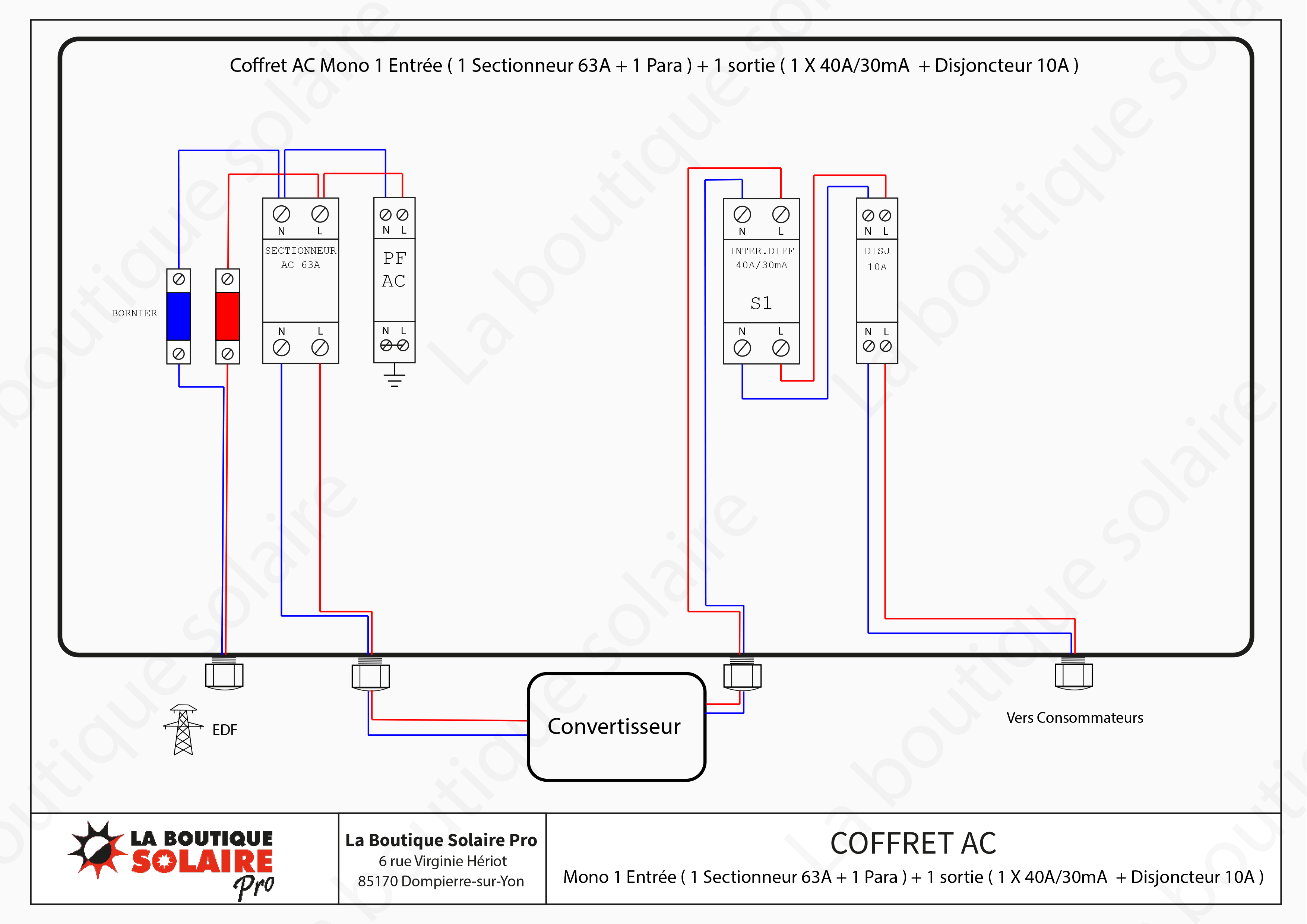Coffret AC Mono 1 entrée (1 Sectionneur 63A + 1 Para) + 1 sortie (1 x 40A/30mA + Disjoncteur 10A)
