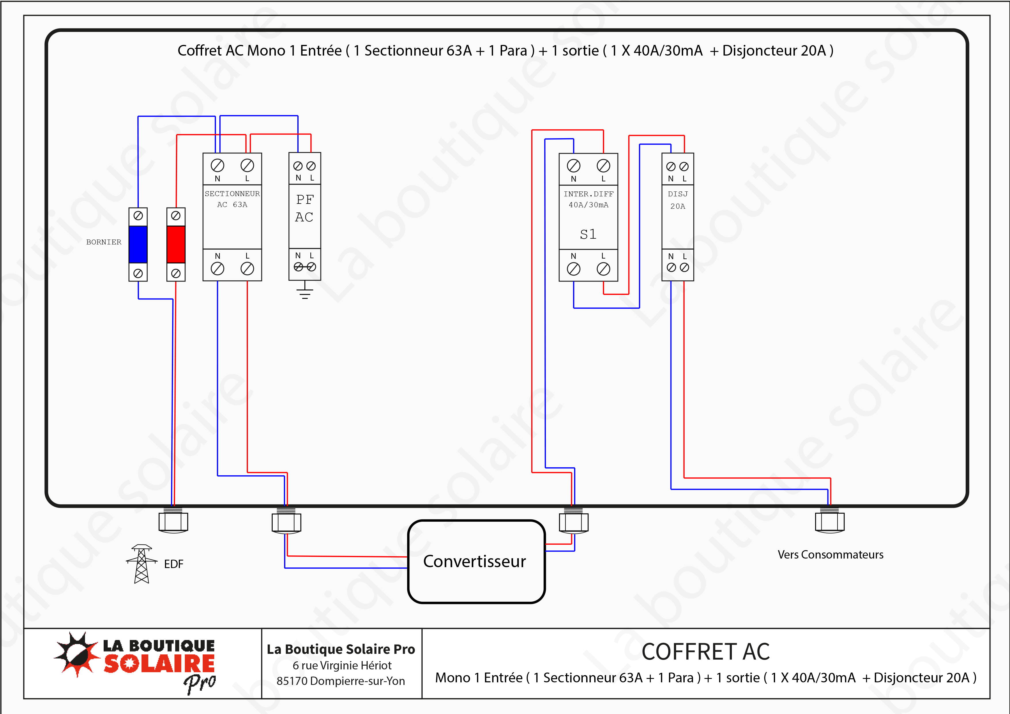 Le coffret AC peut être composé d'un sectionneur + parafoudre entre l'EDF et l'onduleur ainsi qu'un inter-différentiel et un disjoncteur pour protéger la sortie du tableau électrique.