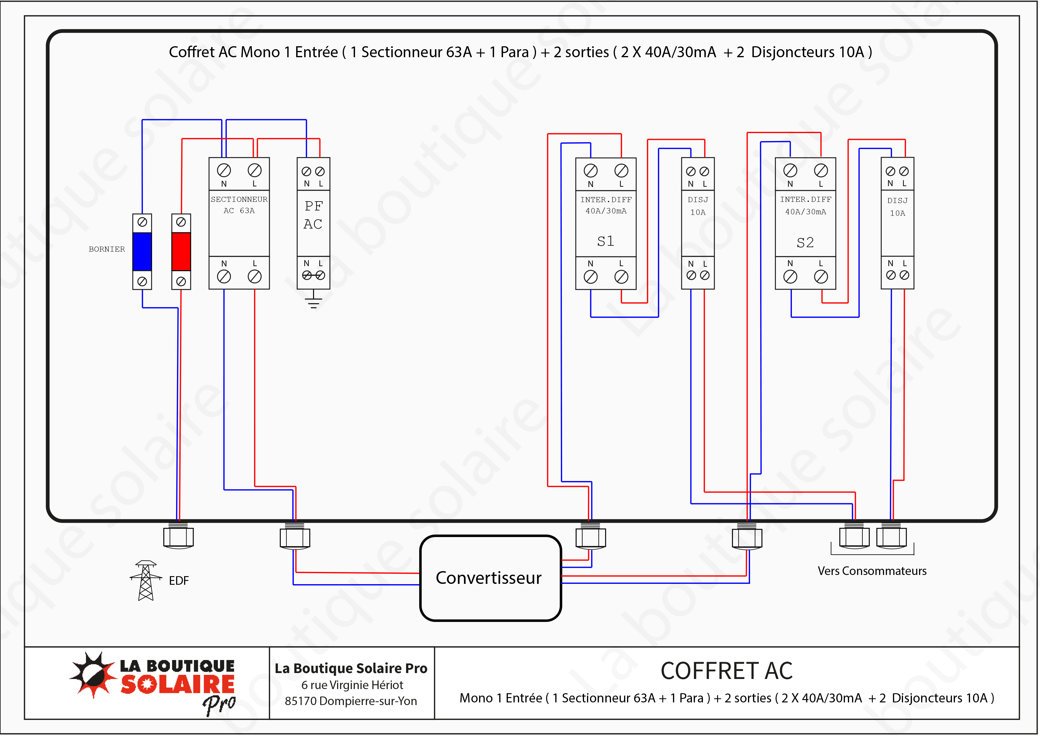 Coffret AC Mono 1 entrée (1 Sectionneur 63A + 1 para) + 2 sorties (2 x 40A/30mA + 2 x Disjoncteurs 10A)