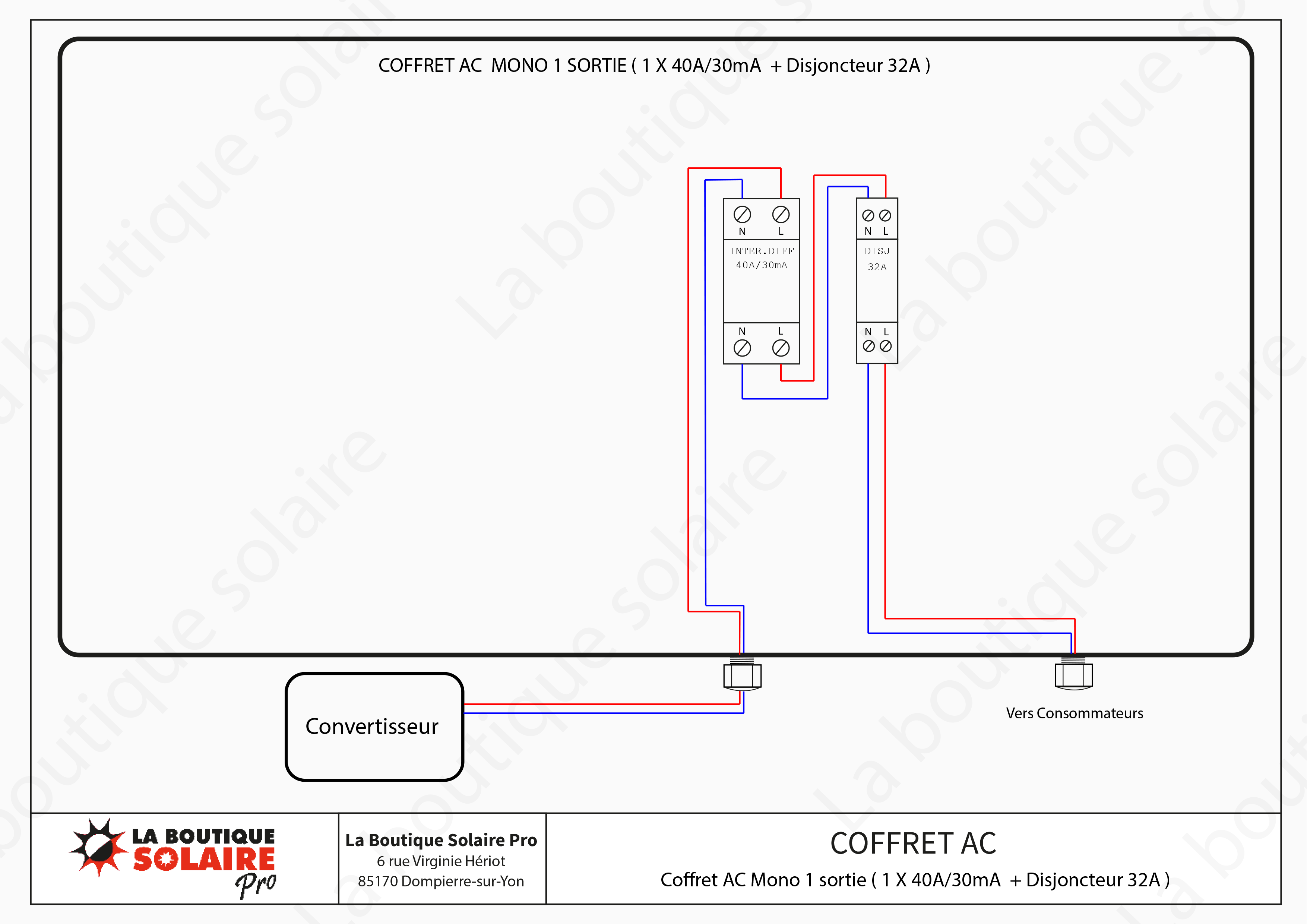 Le coffret AC peut être composé d'un sectionneur + parafoudre entre l'EDF et l'onduleur ainsi qu'un inter-différentiel et un disjoncteur pour protéger la sortie du tableau électrique.