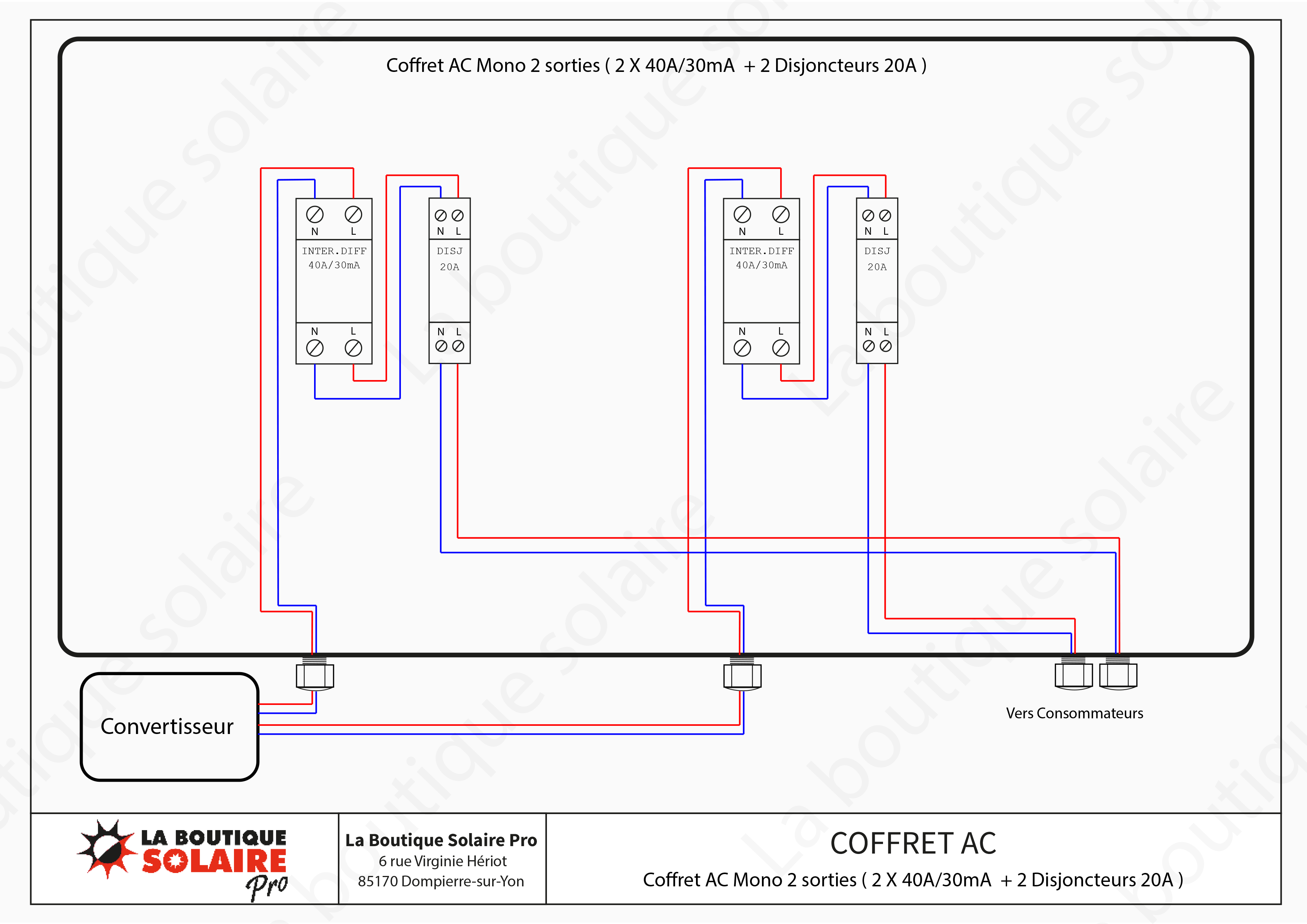 Le coffret AC peut être composé d'un sectionneur + parafoudre entre l'EDF et l'onduleur ainsi qu'un inter-différentiel et un disjoncteur pour protéger la sortie du tableau électrique.