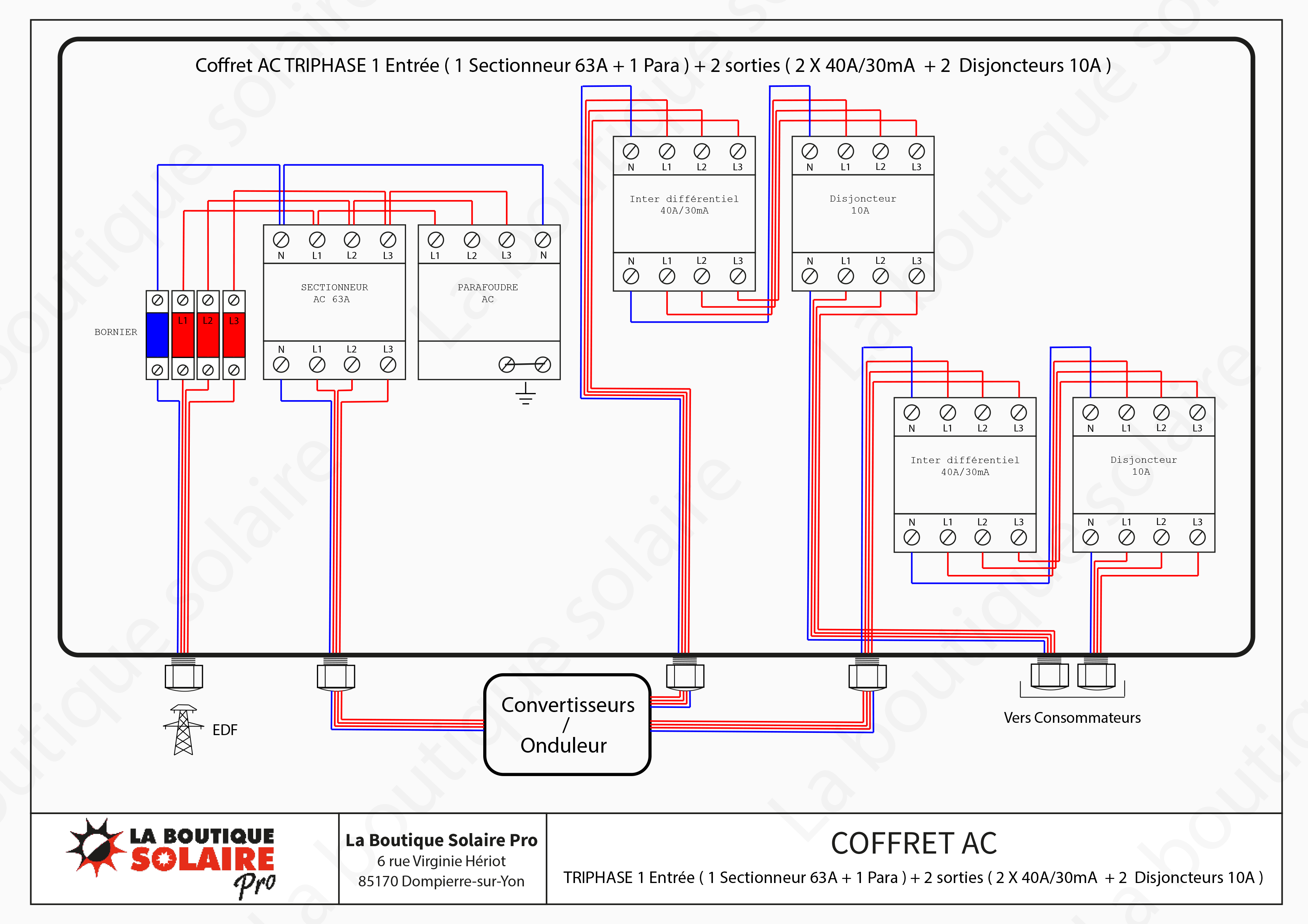 Le coffret AC triphasé peut être composé d'un sectionneur + parafoudre entre l'EDF et l'onduleur ainsi qu'un inter-différentiel et un disjoncteur pour protéger la sortie du tableau électrique.