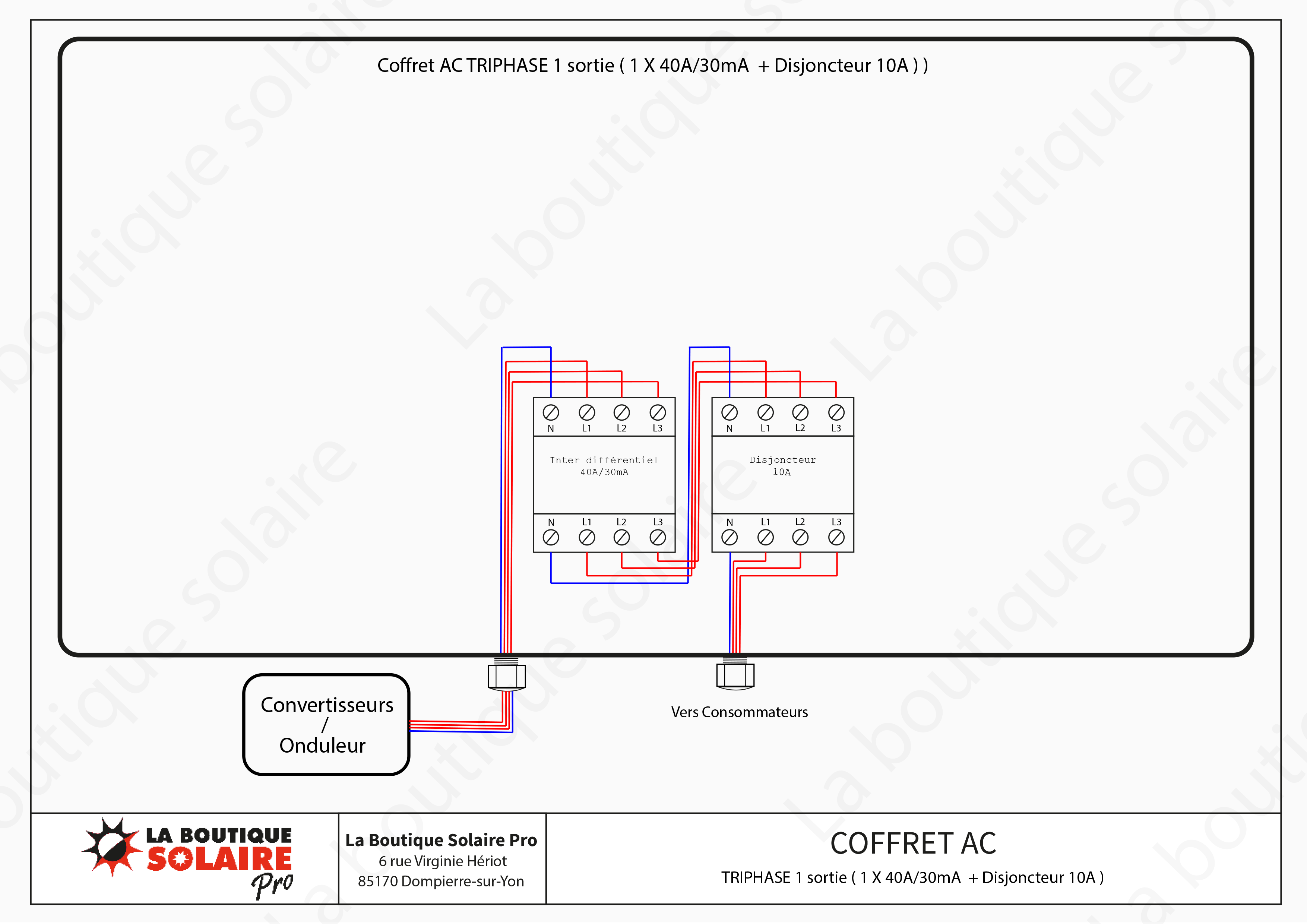 Le coffret AC triphasé peut être composé d'un sectionneur + parafoudre entre l'EDF et l'onduleur ainsi qu'un inter-différentiel et un disjoncteur pour protéger la sortie du tableau électrique.
