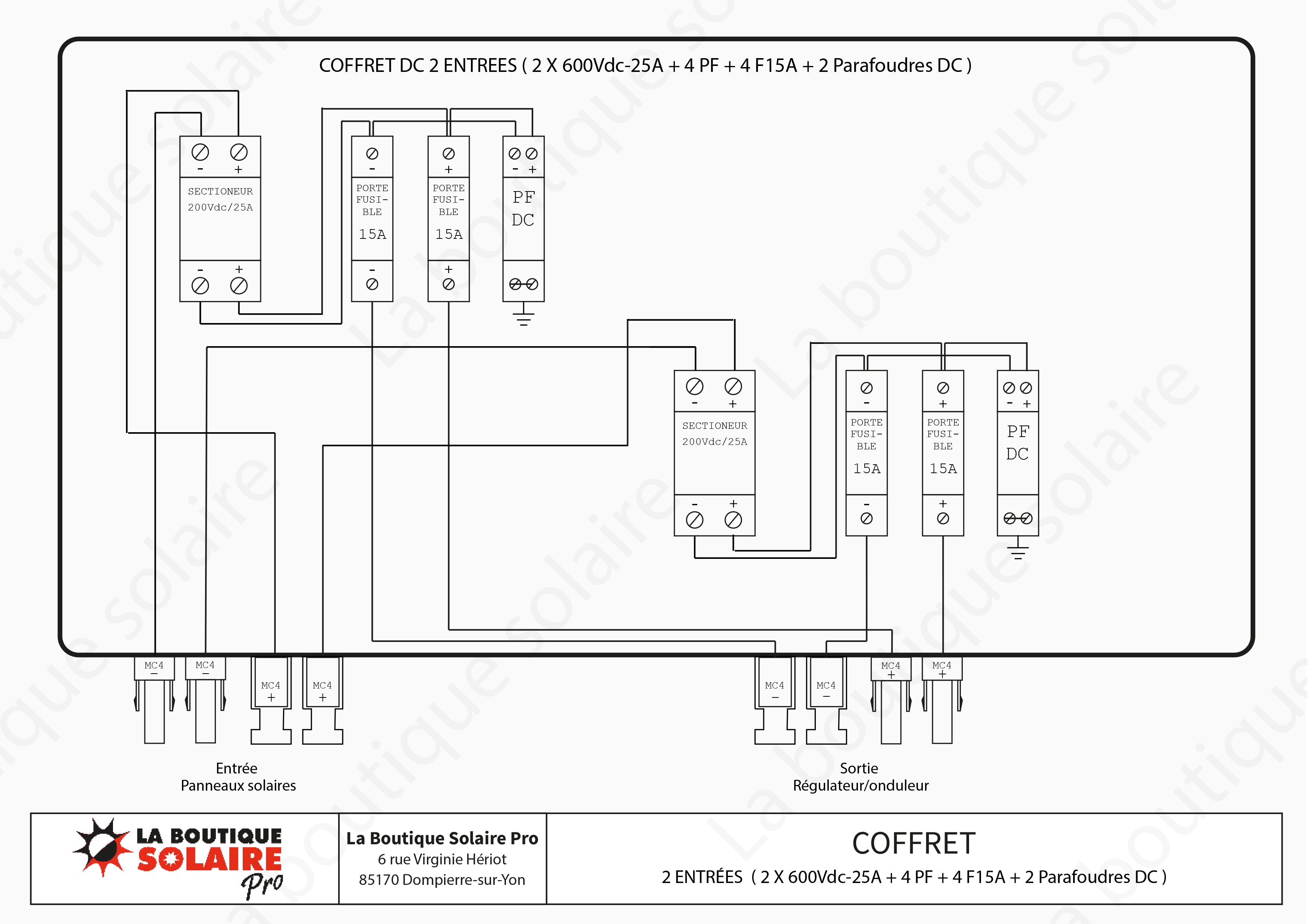 Coffret DC 2 entrées (2 x 600Vdc-25A + 4 PF + 4 F15A + 2 Parafoudres DC)