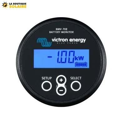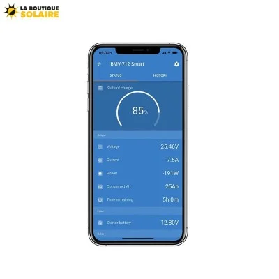L'écran affiche les paramètres à la fois du contrôleur de charge solaire, de la batterie et du convertisseur. Il est même possible d'avoir accès à ces paramètres et de les configurer depuis votre smartphone ou un autre dispositif ayant une connexion Bluetooth via l'application Victron Connect.