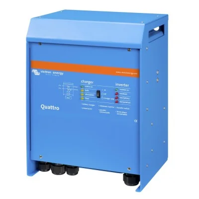 Il permet de convertir la tension des batteries en tension réseau 230V avec une puissance de sortie de 8000 Va semblable au MultiPlus,le Quattro combine également un ensemble convertisseur et chargeur.
