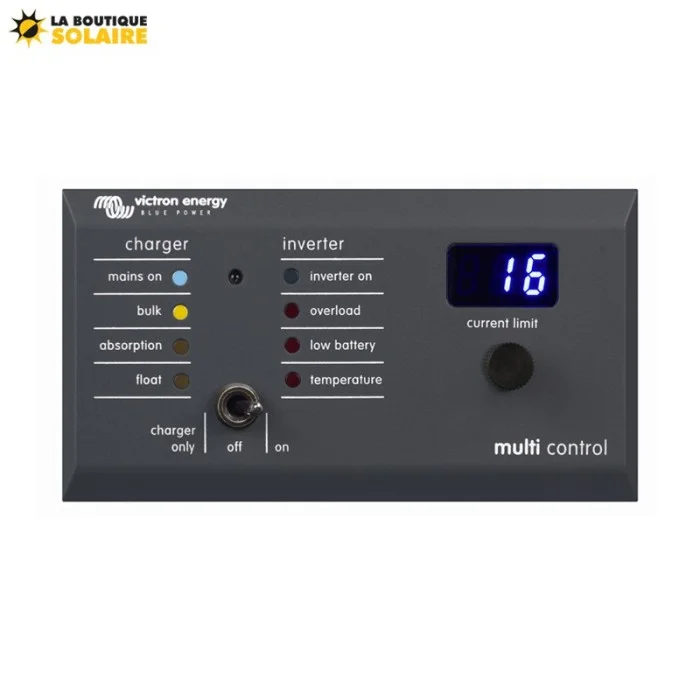 Le tableau de contrôle numérique Digital Multi Control est utilisé pour consulter et ajuster les courants d'entrée CA, et pour allumer et éteindre à distance les Multi ou les Quattro.